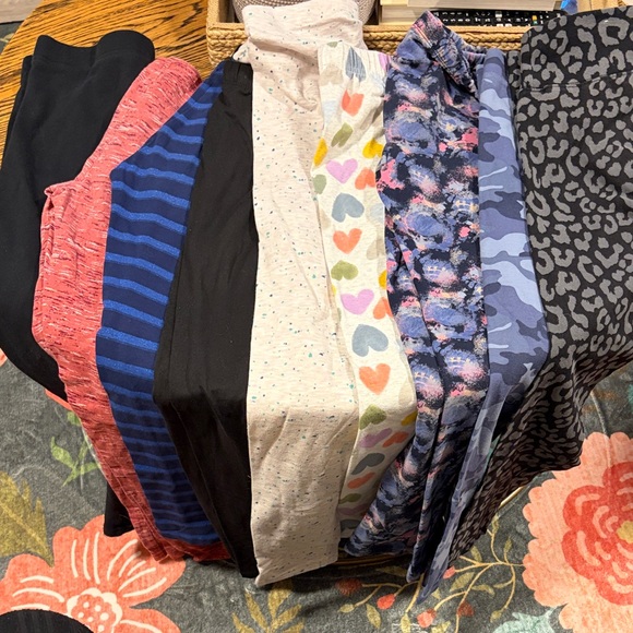 Set of colorful patterned leggings. Includes stripes, hearts, and camo designs. Perfect for casual wear. There are nine in total. Mostly xl and a couple of larges which fit more like xl. Black pair is fleece lined. Brands include, Tommy, Oshkosh, old navy, carters, gap, justice. No rips or wear and tear.