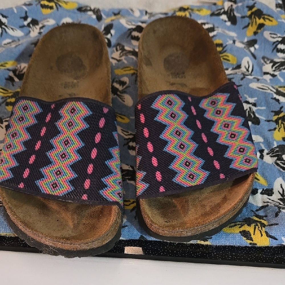 Vibrant sandals with a colorful zigzag pattern. Perfect for casual wear.