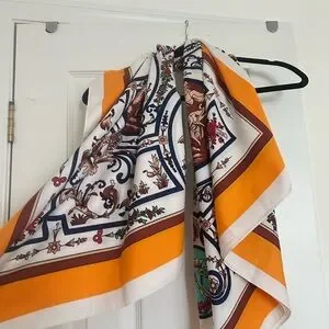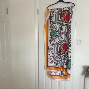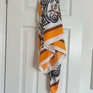 Vibrant scarf with intricate patterns. Features orange, white, and blue colors.