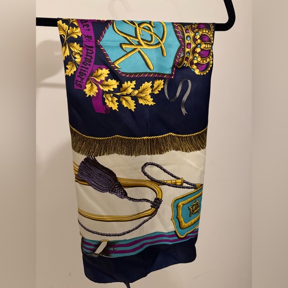 Vibrant scarf with intricate patterns. Features blue, purple, and gold accents. No tags. Preloved. I was told by the owner that it is silk. Approx measurements- 70 inches by 36 inches