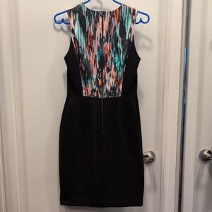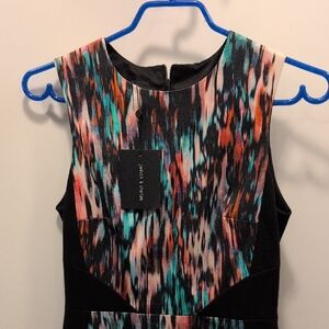 This vibrant sleeveless dress features a striking multicolor pattern, perfect for making a statement. The dress combines elegance with a modern touch, ideal for any occasion.