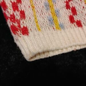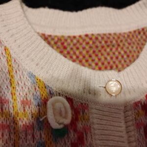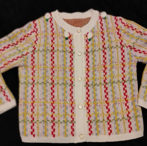 Stay cozy and stylish with this colorful patterned women's cardigan. Featuring a vibrant mix of red, yellow, and green on a cream base, this sweater is perfect for adding a pop of color to your wardrobe.