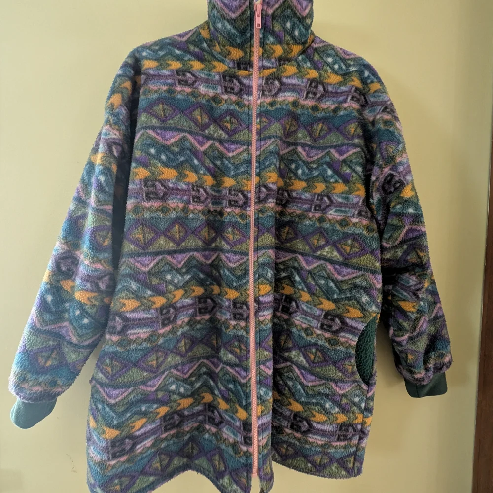 Stay warm and stylish with this vibrant patterned jacket. Featuring a mix of purple, green, and orange hues, this jacket is perfect for adding a pop of color to your wardrobe.