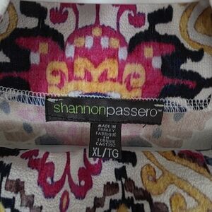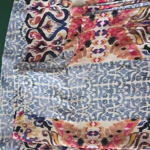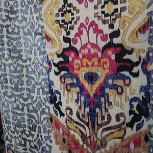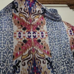 Vibrant women's top featuring a stunning mix of blue, pink, and yellow patterns. Perfect for adding a pop of color to your wardrobe. Slight cowl neck. Looks great with off white turtleneck underneath too.
