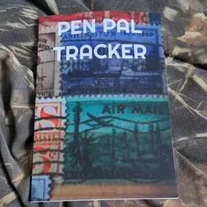 Colorful pen pal tracker notebook with vibrant stamp design. Perfect for organizing pen pal correspondence.