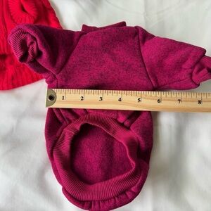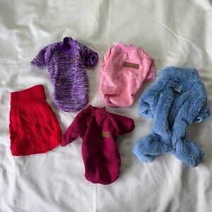 Vibrant set of pet clothing featuring purple, pink, red, and blue pieces. Perfect for stylish pets.