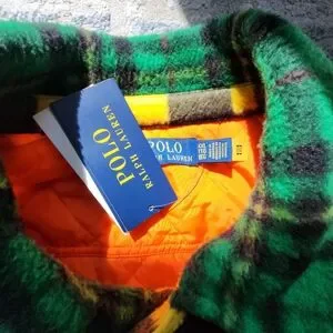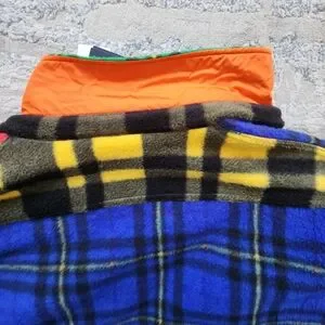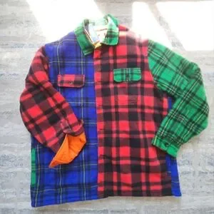 Vibrant plaid patchwork jacket with red, green, and blue patterns. Features buttoned pockets and a unique design.