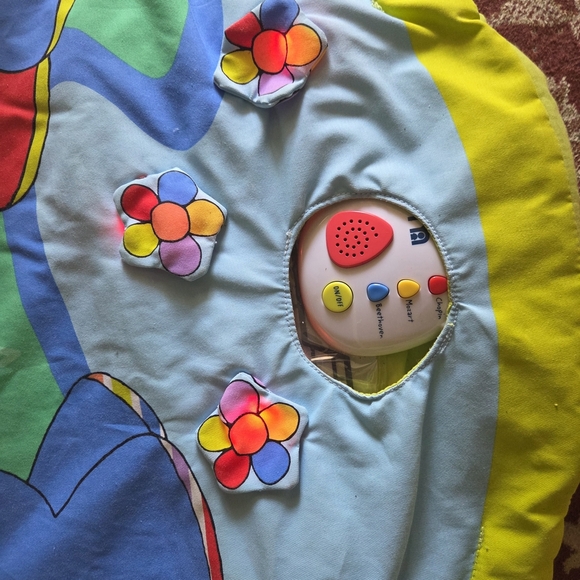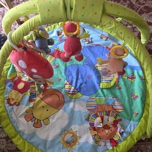 Engage your child with this vibrant play mat featuring hanging toys. The mat includes bright colors like blue, yellow, and pink, perfect for stimulating your child's senses. Ideal for playtime fun.