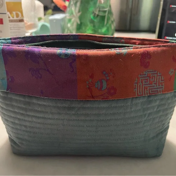 This vibrant pouch features a unique patchwork look design with a blend of colors. Perfect for adding a pop of colour to your bag to hold makeup and other small items.