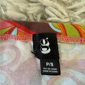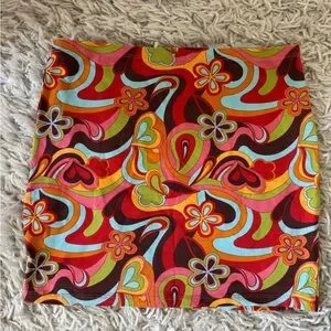Vibrant scarf with a retro floral pattern. Features red, orange, green, and blue swirls and flowers.