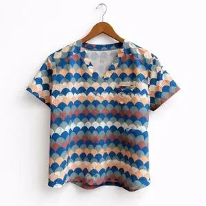 Add a splash of color to your wardrobe with this vibrant women's top. Featuring a unique scallop pattern in shades of blue, orange, and cream, this top is perfect for any casual outing.