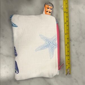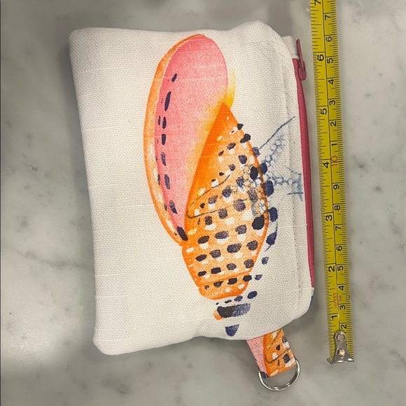Vibrant pouch with a seashell design. Features pink, orange, and blue hues. Perfect for small essentials.