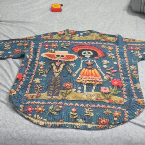Embrace vibrant style with this colorful sweater featuring a unique skeleton pattern. Perfect for adding a playful touch to your wardrobe.