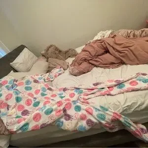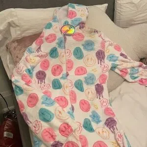 Brighten up your sleep with this colorful smiley face onezie. Featuring a playful design with vibrant colors, it's perfect for adding a touch of fun to your sleep. so cozy and soft. NEW WITH TAGS!