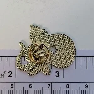 Vibrant enamel pin featuring a snake design. Accents of orange, green, and gold.