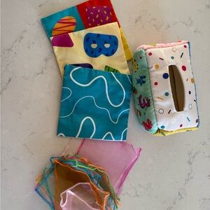 Vibrant baby toy with various textures. Features multicolored fabrics for sensory play.