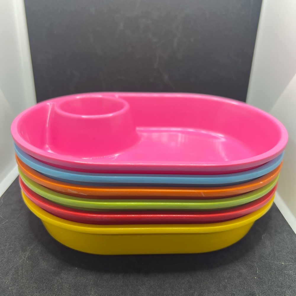 Set of vibrant stackable plates. Includes pink, blue, orange, green, and yellow plates. Perfect for parties or everyday use.