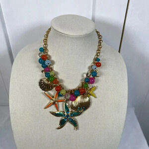Add a splash of color to your outfit with this vibrant necklace featuring starfish and shell charms. Perfect for any occasion.