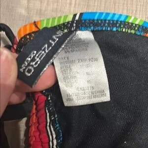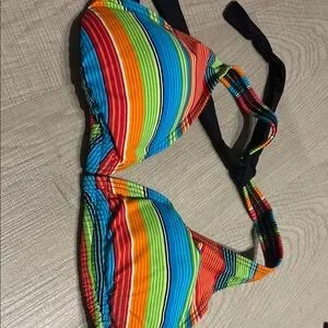 Vibrant striped bikini top with adjustable black straps. Perfect for a bold beach look.