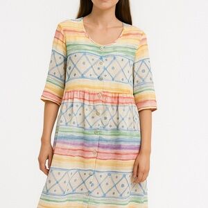 Vibrant dress with multicolor stripes and geometric patterns. Features a button-up front and three-quarter sleeves.