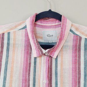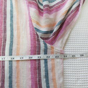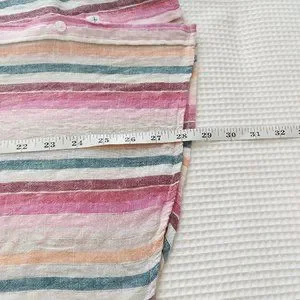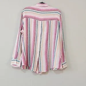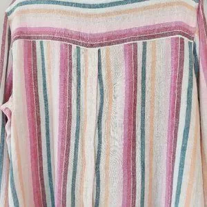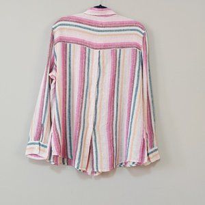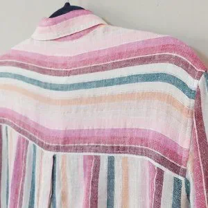 Elevate your wardrobe with this vibrant striped button-up shirt. Perfect for any occasion, this top features a blend of pink, green, and cream hues. Enjoy the comfort and style it brings to your everyday look.