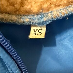 Vibrant blue puffer vest with red, orange, and yellow stripes. Features zippered pockets.