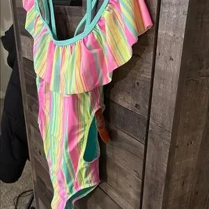 Vibrant swimsuit with ruffle detail. Features colorful stripes in pink, yellow, and green. Kid preteen friendly . Never worn.