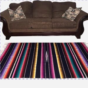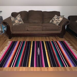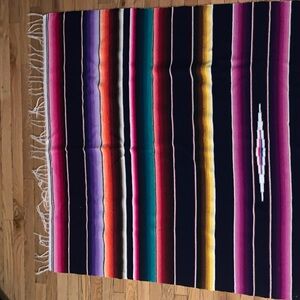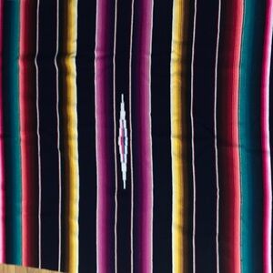 Early 1900s Handmade Antique Fine Wool Mexican Saltillo Serape Blanket/Rug Vibrant Rug with multicolor stripes. Features pink, purple, orange, green, and black hues.