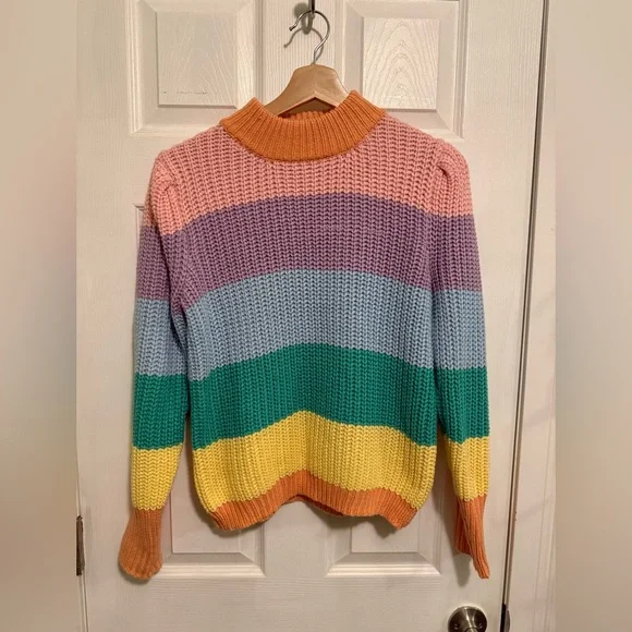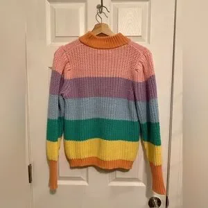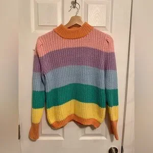 Stay cozy and stylish with this colorful striped sweater. Featuring vibrant shades of pink, purple, blue, green, yellow, and orange. No visible snags or pulls. Never worn.