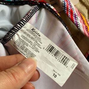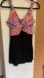 Vibrant striped swimsuit top with a black bottom. Perfect for a stylish beach day.
