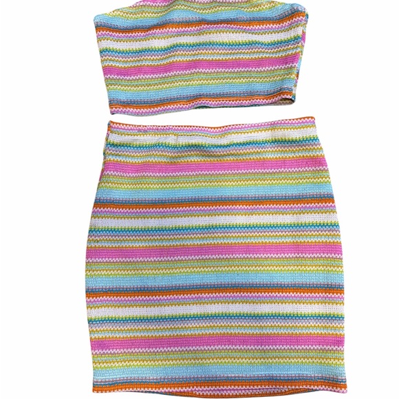 Vibrant two-piece set with multicolor stripes. Includes a strapless top and matching skirt. Perfect for a fun, casual look.