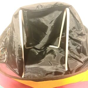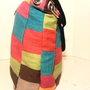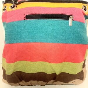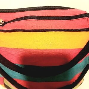 Brighten your day with this vibrant striped tote bag. Featuring bold colors, it's perfect for adding a pop of color to any outfit. Zipper Closure. Gusseted. Fully lined washable. Double handles (8 inch drop) 8.5 12 x 12 x 6 inches.
