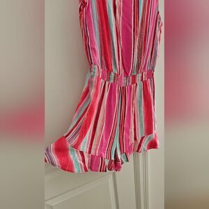 Vibrant sleeveless romper with pink, blue, and red stripes. Features tie look straps and a scoop neckline. beebop be you be free romper