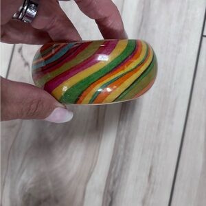 Add a pop of color to your outfit with this vibrant swirl bangle bracelet. Perfect for any occasion.