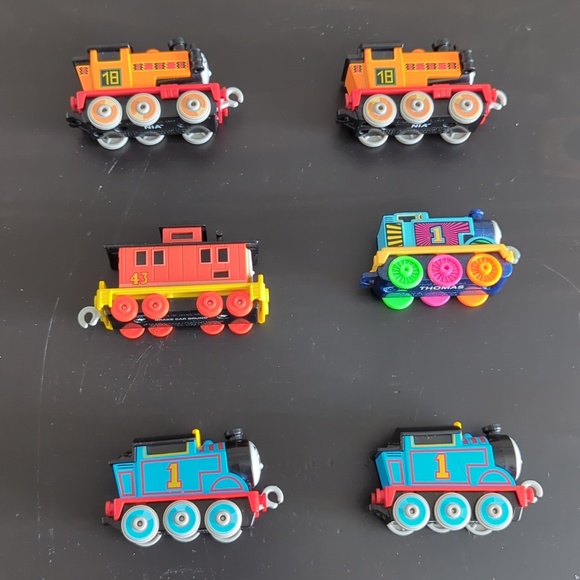 Comes with 2 Thomas, 1 colourful Thomas, 2 Nia, and 1 Brake Car Bruno. Connects to each other. Fits most tracks (wooden, plastic, etc.)
