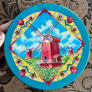 Add charm to your home with this colorful storage tin featuring a vibrant windmill design. Ideal for organizing small items while enhancing your decor.