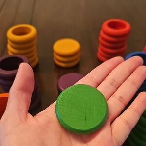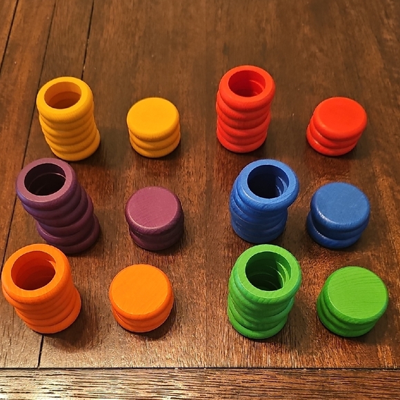 Vibrant wooden stacking discs in multiple colors. Perfect for play and learning.