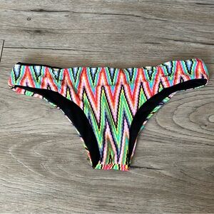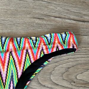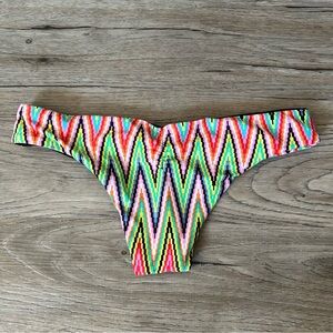 Vibrant zigzag pattern bikini bottom. Features a mix of colors including pink, orange, green, and blue.