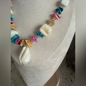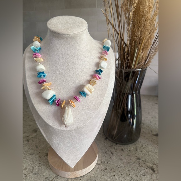 Add a pop of color to your outfit with this vibrant handmade shell necklace. Featuring a mix of cream, pink, blue, and gold beads, this piece is perfect for any occasion.