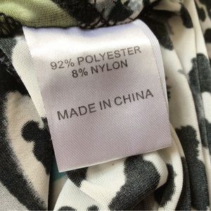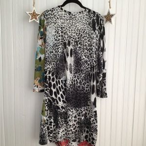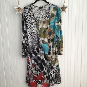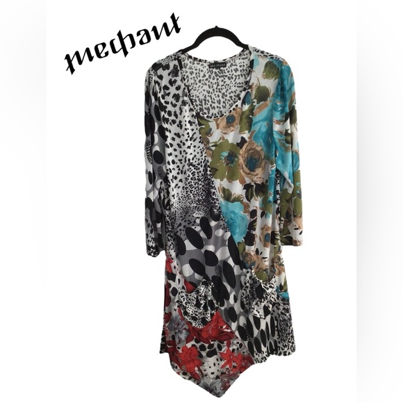 Vibrant dress with a mix of patterns. Features shades of black, white, green, blue, and red.