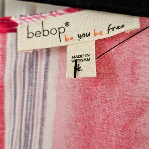 Vibrant sleeveless romper with pink, blue, and red stripes. Features tie look straps and a scoop neckline. beebop be you be free romper