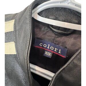 A two-tone moto-style leather jacket from Colori. A biker jacket, characterized by its practical design often associated with motorcyclists. Features a two-tone design, primarily black with contrasting white panels and stripes on the sleeves and sides. Includes a front zipper closure, a small zippered pocket on one lower side, and a stand collar. The sleeves have vertical stripes in the contrasting color, adding a sporty or racing-inspired element to the design.