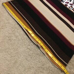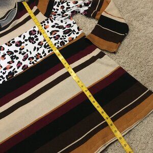 Very good preowned condition, soft, knit, rayon sweater by Celeste featuring Colourblock stripes in marigold brown, black, creamy beige, burgundy and espresso brown, as well as a leopard/animal print stripe in the same colour palette. Long coverage and comfortable.