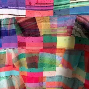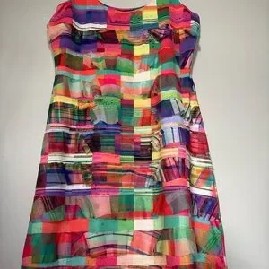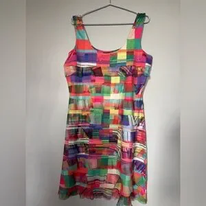 Vibrant multi-colour ruffle dress with lightweight, smooth fabric. Sleeveless, straight silhouette. Eye-catching mix of bright hues, perfect for summer.