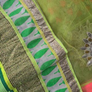 Gorgeous boho style anarkali with green churidar and net dupatta. The back is low and has stunning mirror details on the ties. It is cotton and lined. The colours on this piece really pop.