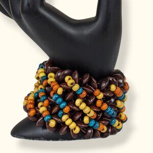This bracelet is beaded with dyed beads and is strung on an elastic cord. The "interior" beads are a dark brown and are shaped like round discs with sharpened edges. The "exterior" beads have the appearance of diagonal stripes and are blue, orange, and yellow. The bracelet is wide and comfortable to wear. There is normal wear, but no issues affecting wearability.