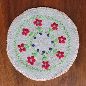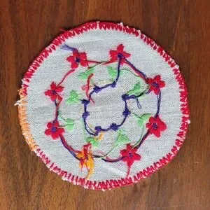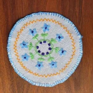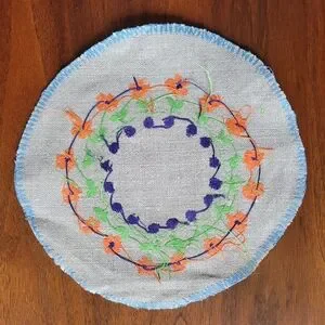 Set of five hand-embroidered linen coasters with floral designs. Features vibrant colours, including red, orange, blue, green, and purple.