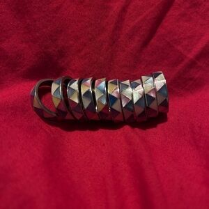 Set of 10 rings with colorful geometric patterns. Features shades of blue, pink, and yellow shells, held in a metal ring. Assorted sizes. All 10 come together, great idea for party favours!
