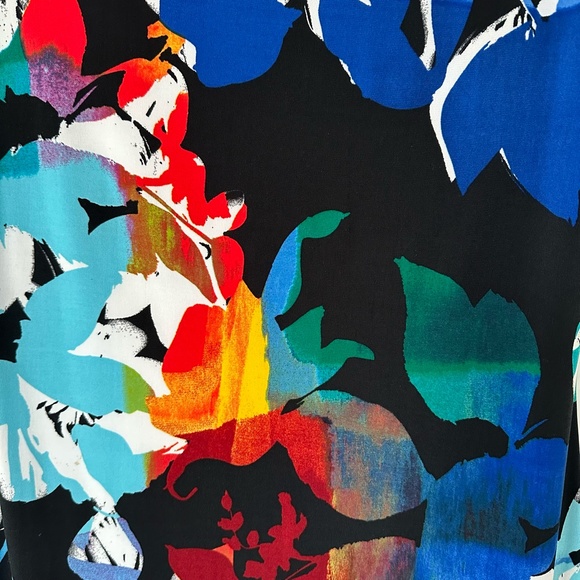 Colourful Papillon Blanc knee-length dress with cute button detail on the sleeves. Neck is slightly scooped. Fabric and size tag is missing, but I know that it is a M. Fabric feels like 100% polyester and has a nice stretch.
