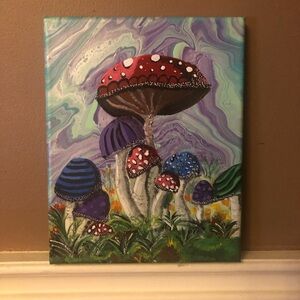 Colourful Patch of Mushrooms on an 8”x10” Original Hand Painted Stretched Canvas w/ Acrylics.